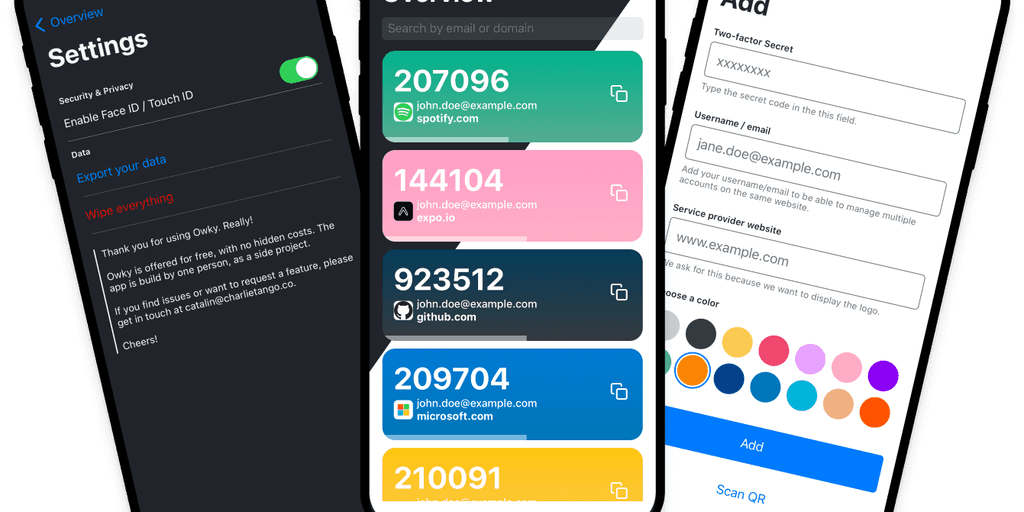 Owky is a free and open source Two Factor Authentication (2FA) application, which generates Time-based One-Time Passwords (TOTP).