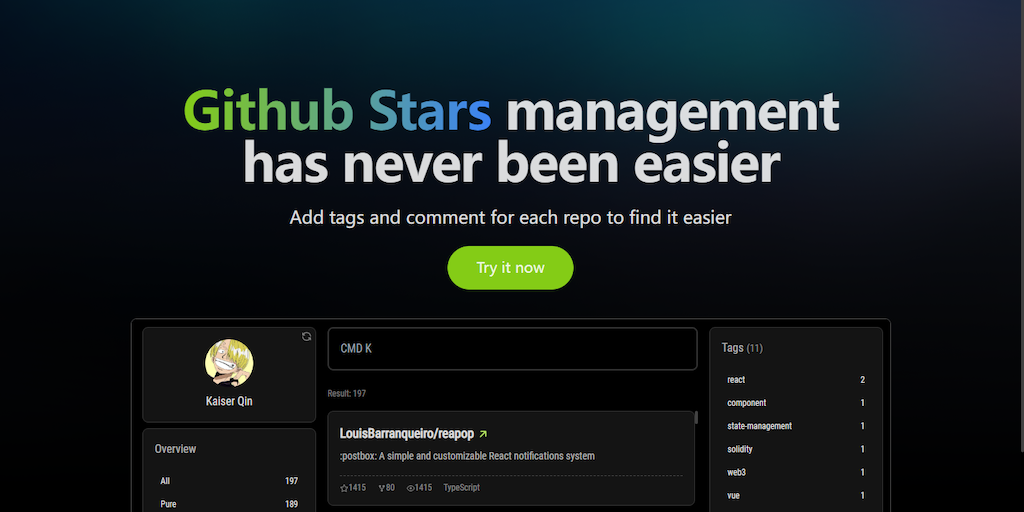Add custom tags and comments to your github star repos. Make it easier for you to manage and find them.