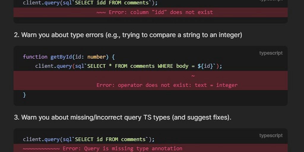 SafeQL is an ESLint plugin for writing SQL queries in a type-safe way. - Automatic Type Inference & Validation - Compatible With Popular SQL Libraries - Easy To Use - Built with Monorepos & Microservi
