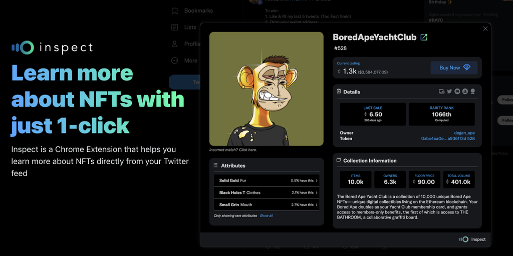 Inspect is a Chrome Extension that helps you learn more about NFTs and their communities directly from your Twitter feed. We connect images to on-chain assets to make your web3 experience on Twitter f
