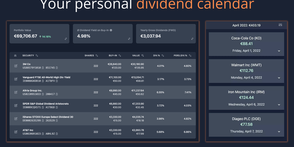 DivvyDiary is an elegant dividend calendar with built-in dividend reports 🤑 Track your cashflow from dividends - stocks, ETFs, CEFs... 🌎 Easy portfolio import / export and open API. 📈 All important di