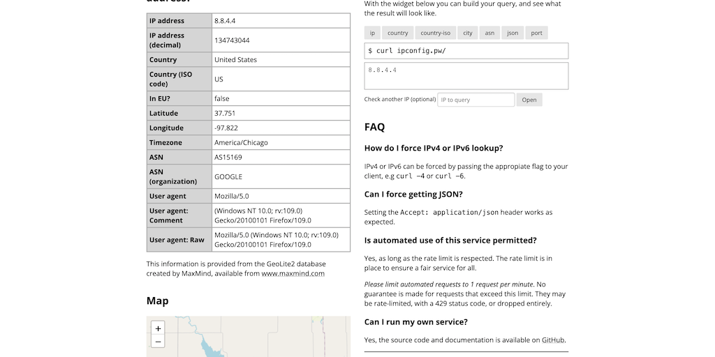 A one page application to help internet users find information about their public IP address or any other IP address, be it IPv4 or IPv6. This tool is also available for developers and can be accessed