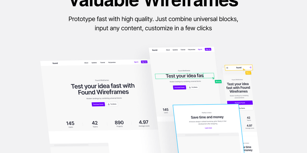 Found is a design asset with ready website blocks. Combine them to get a website in a moment, input any content, customize in a few clicks. Get high-quality Figma prototypes fast.