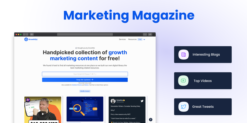 Marketing Magazine by Growthfyi is digital magazine in form of an app(web & Android) which contains all great marketing content in one single place. This helps you find the best marketing content by s