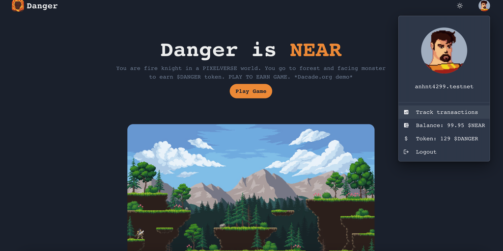 Danger is near (play to earn game, gamefi on near chain testnet) - user play as a fireknight in a PIXELVERSE world who go to forest and kill monster. User can earn $DANGER token and score to compete w