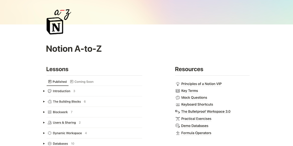 Notion A-to-Z is a profound new way to learn Notion, prepare for certification, and keep current. It’s an interactive journey to Notion mastery, strategically instilling the technical and tactical ski