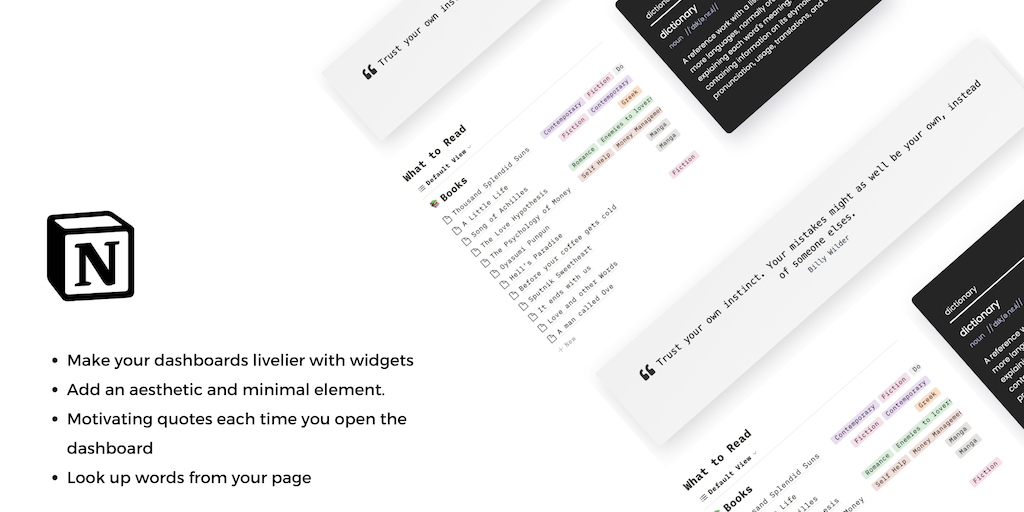 Get 2 unique widgets and make your notion dashboards even more interesting. Search new words and find motivating quotes to the homepage. The widgets will increase the minimal aspect of your notion pag