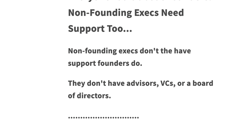 Everyone Talks about Founders. Join a group of Non-Founding Execs for advice on negotiating equity and compensation, team building, and leadership. So you have enough support to be your best, feel con