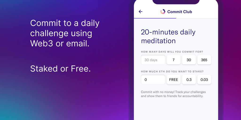 Commit Club incentivizes daily challenges and habits. Staked or free. Web3 or email signup. Publicly shared or private to you. Staked gives you the added bonus of receiving stakes from failed challeng