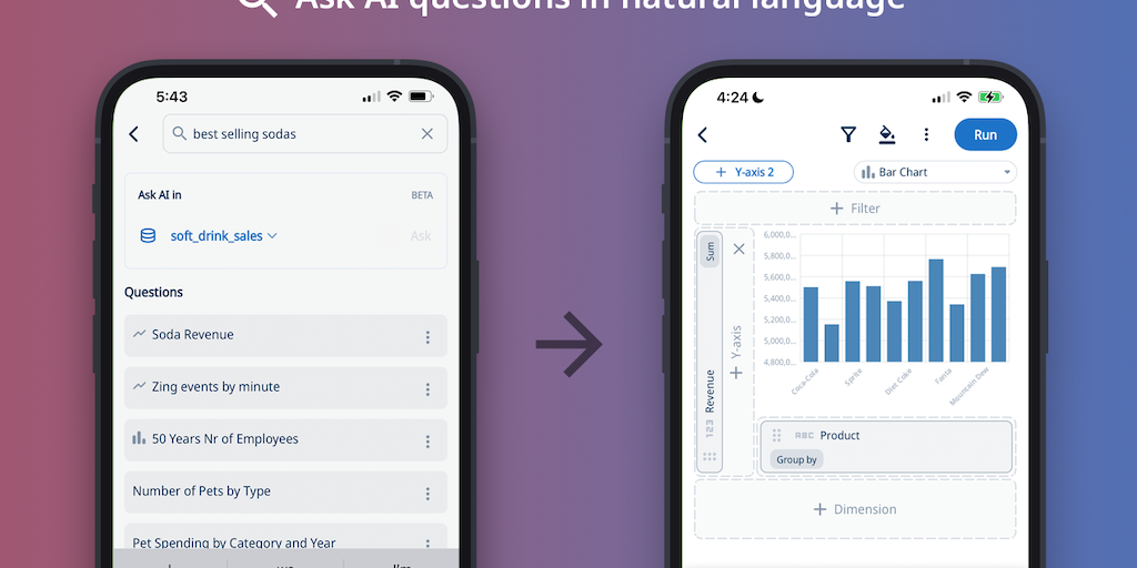 Natural language meets drag & drop UI to get fast answers from mobile or the web -- no need for SQL or a desktop. No data modeling. Ask questions with AI and get *directly manipulable* charts. Ensure