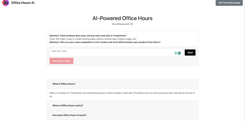 Office Hours AI helps founders think through their startup ideas by asking critical questions and generating a report to evaluate their thinking.