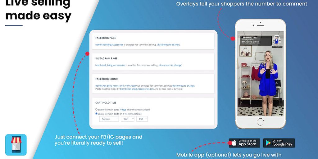 Live Selling Made Easy - Just connect your FB/IG pages and you're ready to go live. Just call out the #'s for your shoppers, or use optional mobile app for overlays. Use directly in Shopify admin. No