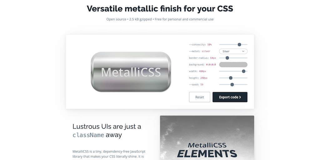 MetalliCSS is a tiny, dependency-free JavaScript library that makes your CSS literally shine. Rather than resorting to pre-rendered static images, MetalliCSS dynamically renders custom-fit graphics. F