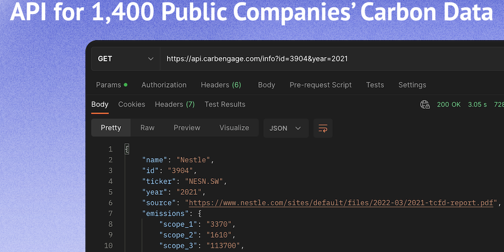 API to access carbon footprint data at company- and product-level. Our database has ~1,400 public companies' carbon emissions data. We're making it super easy to embed climate data in software to help