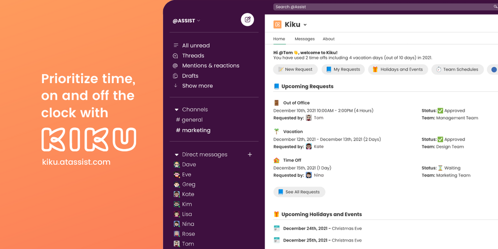 Kiku, a Slack-integrated time off management solution for HR professionals, streamlines time off requests, PTO, birthdays, and work anniversary notifications. Add custom holidays, create announcements