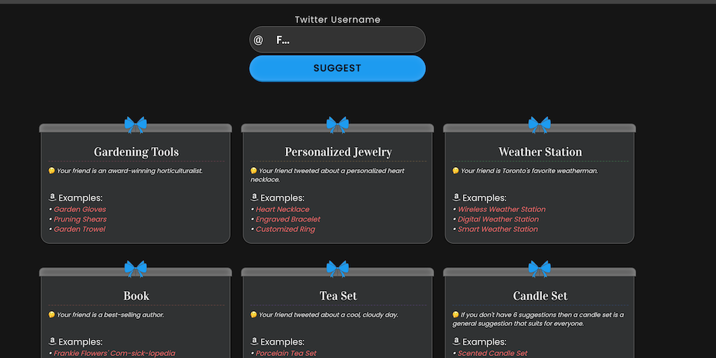 AI-driven gift suggestions based on friends' tweets, making gifting personalized and stress-free.