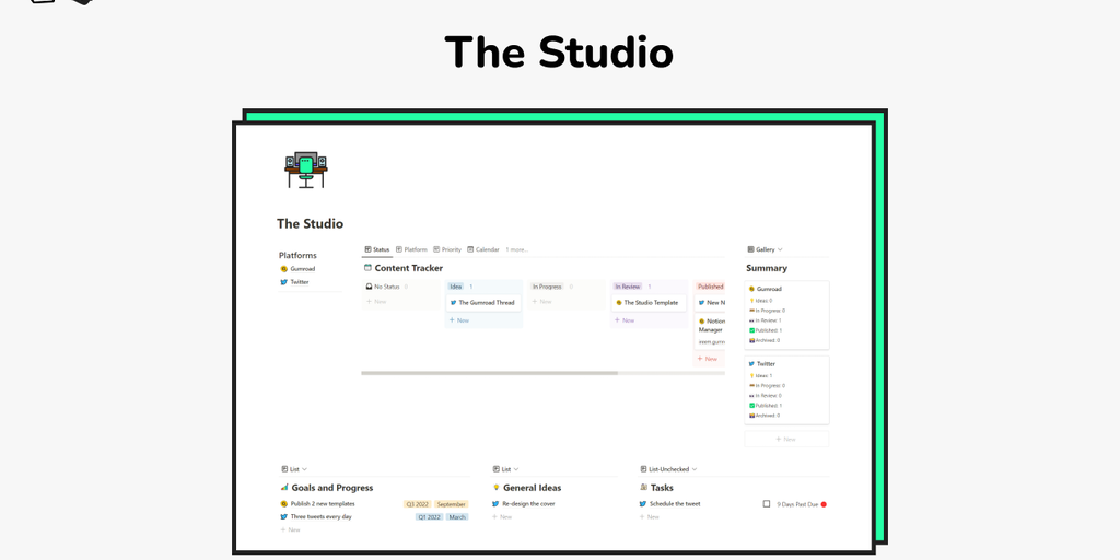 The Studio is the Notion ultimate template for Twitter and Gumroad content creators. Enhance your productivity and improve your content using this template to manage, track, arrange and organize your