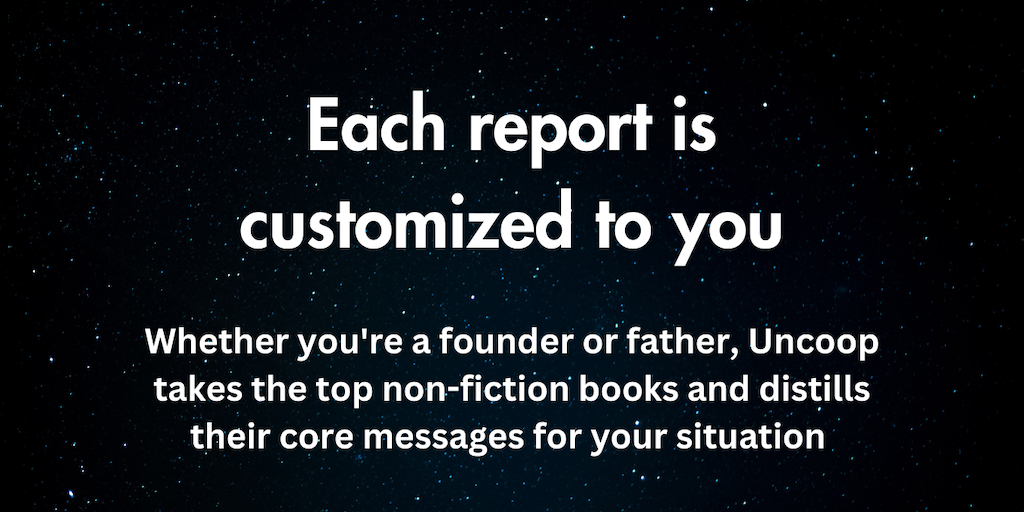Uncoop distills insights & action items from non-fiction books & uses AI to apply them to your life, business, or unique situation. Start leveraging AI & renowned book frameworks to supercharge your o