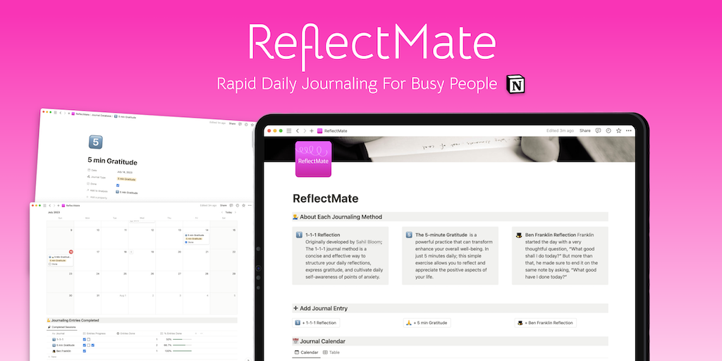 Need a quick and effective way to journal amidst your busy schedule? ReflectMate is the ultimate Notion template designed specifically for busy individuals. Pick from 3 powerful journaling methods tha