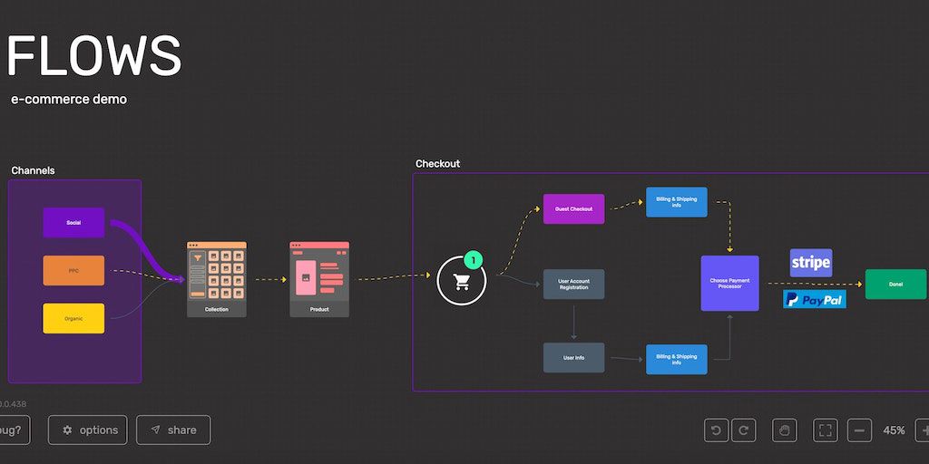 VisualFlows is a 100% FREE whiteboard & flow creator. Easily create Marketing Funnels, User Journey & Flows, Visual Sitemaps, Processes, Mind-Maps, Brainstorms, SEO & Server Architectures +