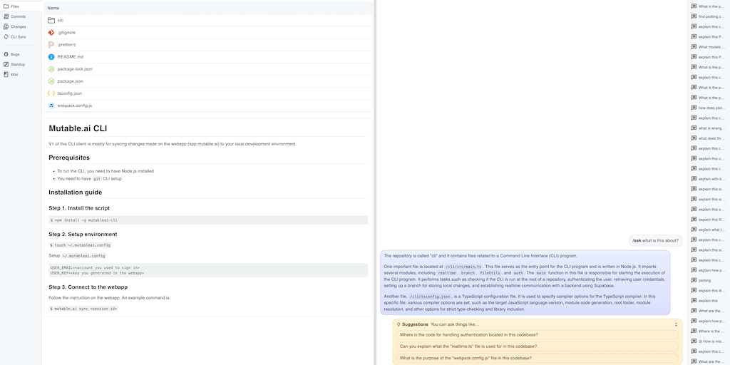 Mutable.ai for codebases. We help you develop software by using (1) AI codegen to create features, (2) AI enhanced explanation and search, (3) Suggest improvements to your code, (4) Seamlessly switch