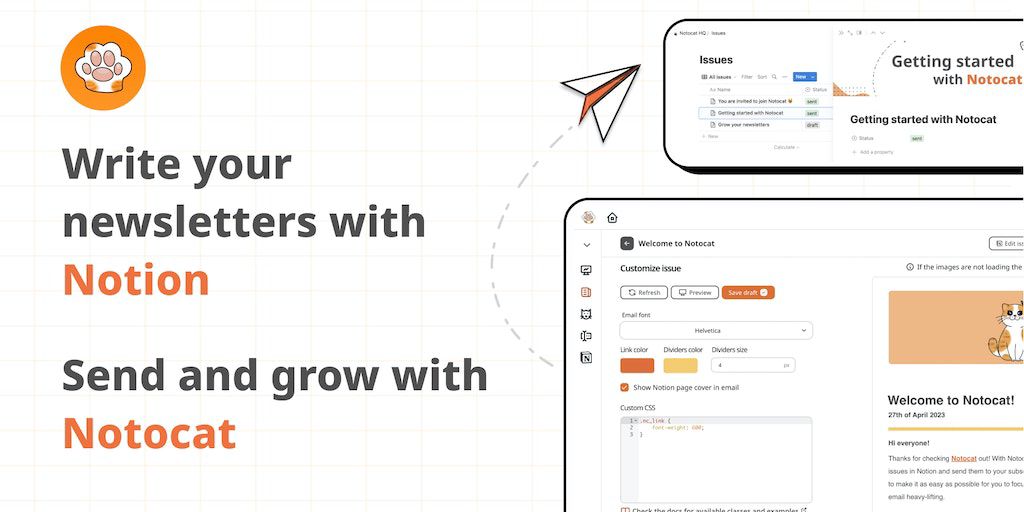 You are finally able to write your newsletter issues in Notion! You can then use Notocat to send these issues to your subscribers. Notocat comes jam-packed with features: issue customization, custom d