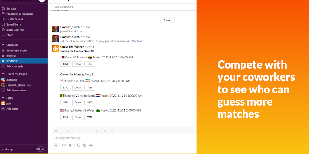 We are a game you can play inside Slack to see who can guess the most sports matches correctly. (ex World Cup) Each day, you'll receive a list of sports matches to guess. You'll get a leaderboard to s