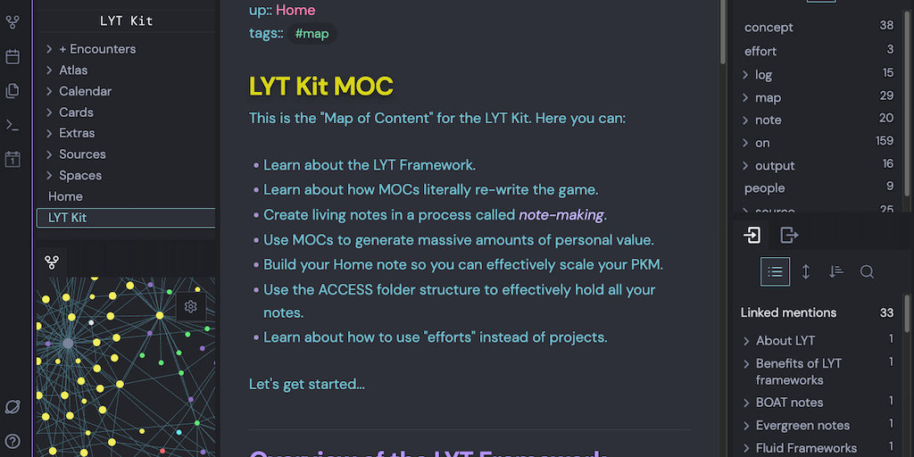 The LYT Kit is a sandbox of linked digital notes. Open it with the Obsidian notes application. It has 250+ notes that are linked 1000+ times. It's the world's most downloaded kit for linked notes (35,