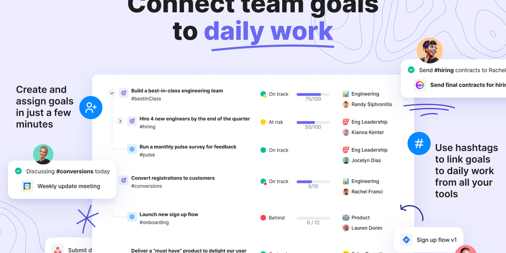 Help your team make daily progress on the goals that matter most. Easily add goal updates to async check-ins and live meetings. Use hashtags to link team goals to work items from tools like Asana and