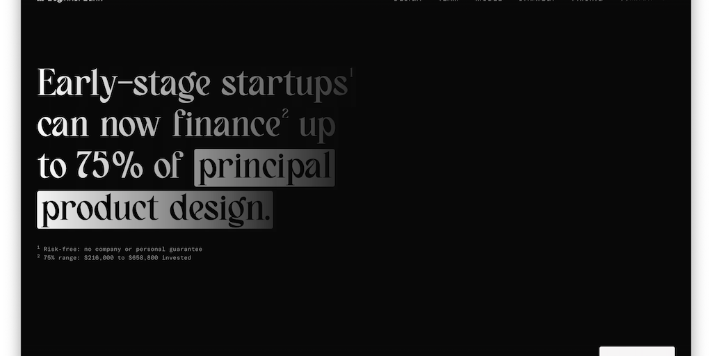 BeginnerBank.com helps early-stage startups get product-led growth by lowering the up-front cost of principal product design. Apply now and finance up to 75%, put 2% down, and pay the balance over 5 m