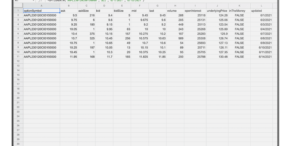 Get real-time, historical, and intraday market data for stocks, options, and indices directly into your Google Sheet with our easy to use add-on. Futures, bonds, crypto, and commodities are coming soo