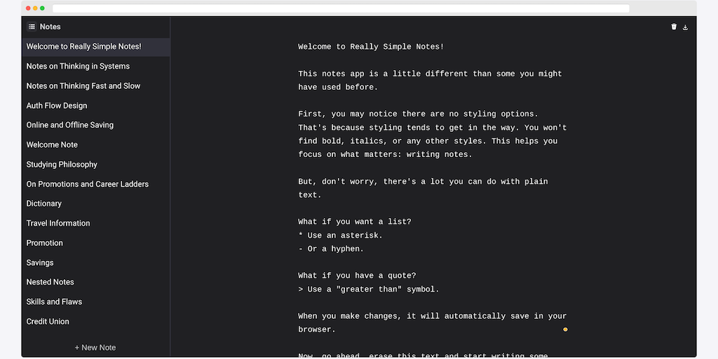 ReallySimpleNotes is different from other note apps. There are no styling options. Styling gets in the way. This helps you focus on writing notes. Your notes are private, only stored on your browser.