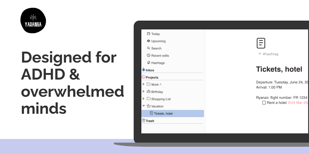 Yaranga is a productivity ally for ADHDers. It allows you to take notes, create to-do lists, and manage content without complex hierarchies and structures. Every feature is designed to help you feel a