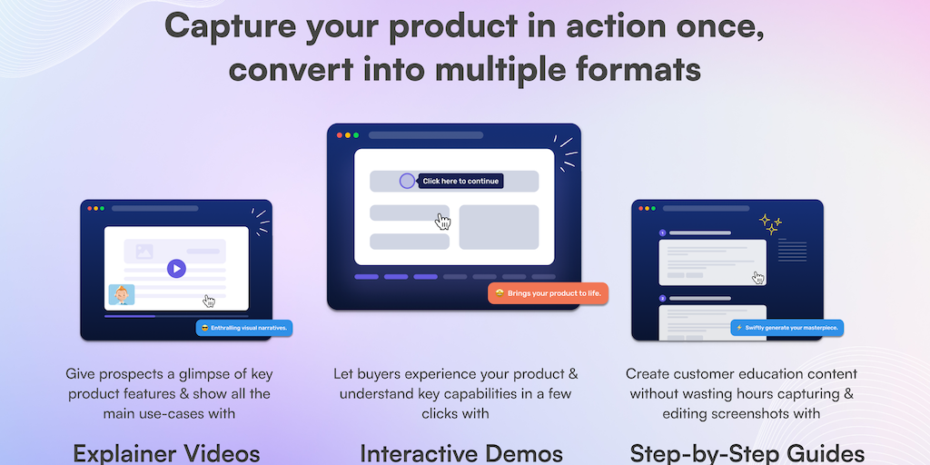 Show your product in action with interactive demos, product videos, and step-by-step guides. Create engaging product content in a breeze with Floik—no matter how quickly your product changes. Educate