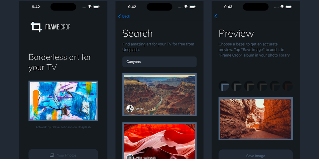 Elevate your Samsung The Frame TV's art mode with Frame Crop. The app allows effortless photo cropping and access to a vast library of royalty-free art and images (via Unsplash) to match your mood and