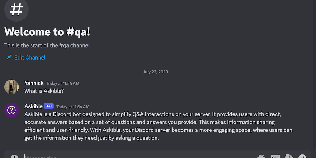 Askible is a Discord bot that simplifies Q&A's on your server. It provides users with direct, accurate answers from a pre-set list, making information sharing efficient and user-friendly. With Askible