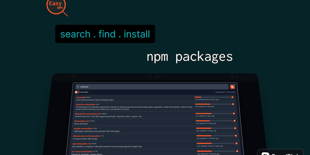 A platform where developers can easily search for nodejs packages and take a glance at details without leaving the page. One-click copy option for popular package managers like npm, yarn and pnpm.