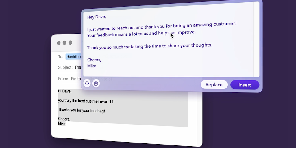 Using Finito is easy. Select text anywhere, hit the Control key and pick how you want AI to assist you. Finito uses ChatGPT to help you correct grammar, answer questions, improve your writing 🤩, gener