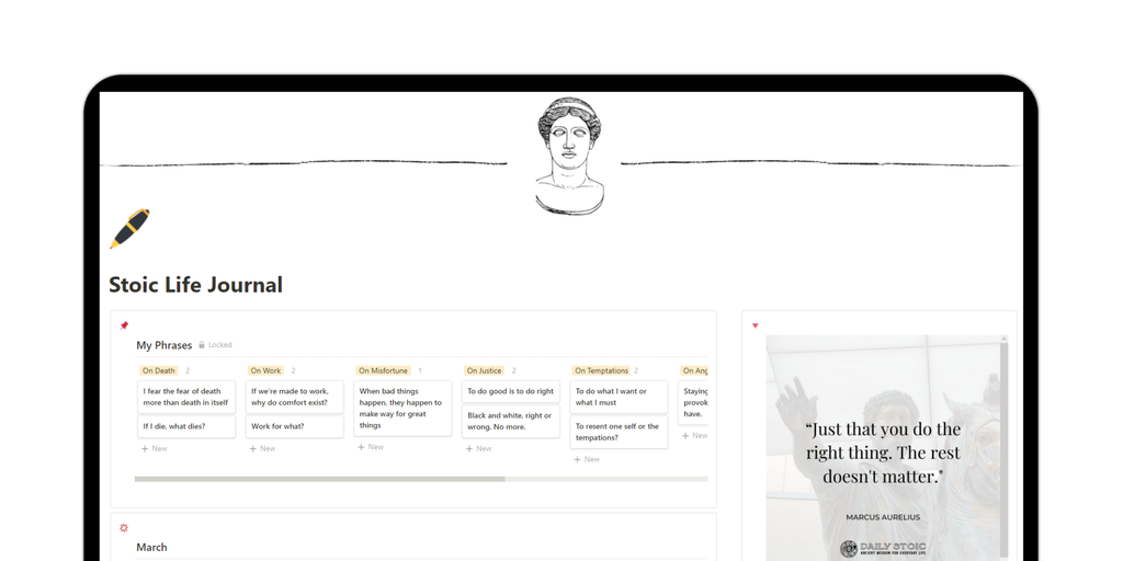 Improve your journaling experience in a way you've never thought possible with this lightweight and digital stoic calendar made with love in Notion.