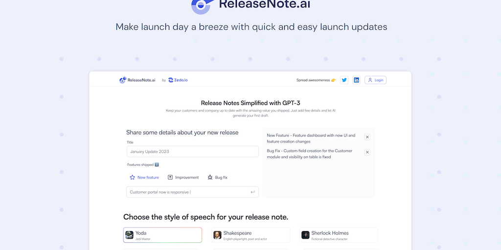 Want to create engaging release notes in seconds? Releasenote.ai makes it super easy. Just list down your features & updates, and let the AI write your first draft. Make your launch day a breeze with