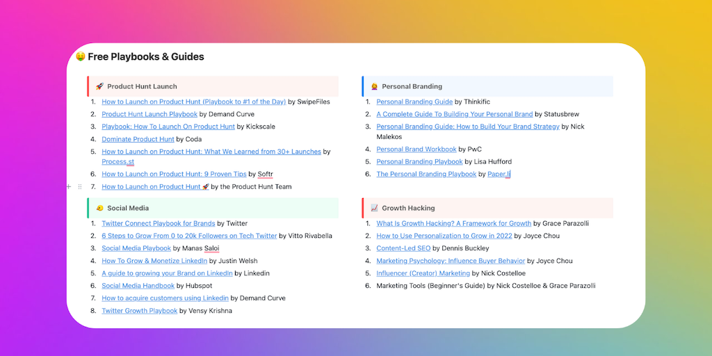 Discover 99+ Playbooks, Guides & Primers on Cold Outreach, PH Launches, Email Marketing, Personal Branding, Growth Hacking & more! The Kit includes Guides by some of the best creators such as Vitto Ri