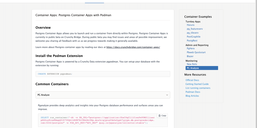 Postgres Container Apps on Crunchy Bridge allow you to seamlessly launch a container from inside Postgres with a single command. Examples include: * Turnkey APIs * Sidecar monitoring agents * Database