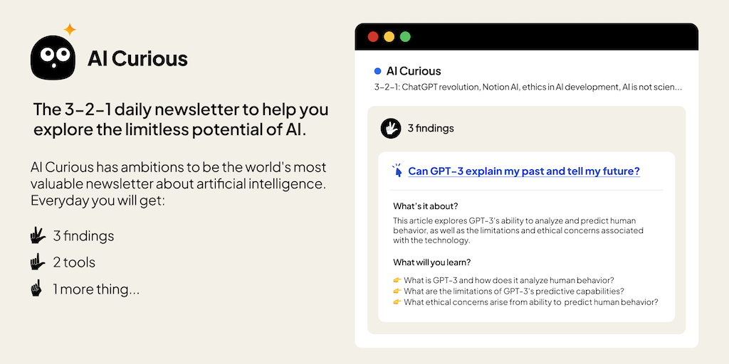 AI Curious has ambitions to be the world's most valuable newsletter about artificial intelligence. Every weekday you will get: 3 findings, 2 tools and 1 more thing... stay AI-curious!