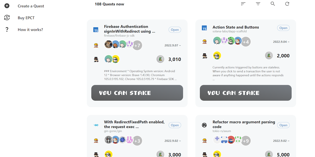 Build to Earn! Epics is a decentralised crowdsourcing platform for incentivising open source software development. Clients can set up a GitHub issue as a Quest (Smart Contract). Developers can receive