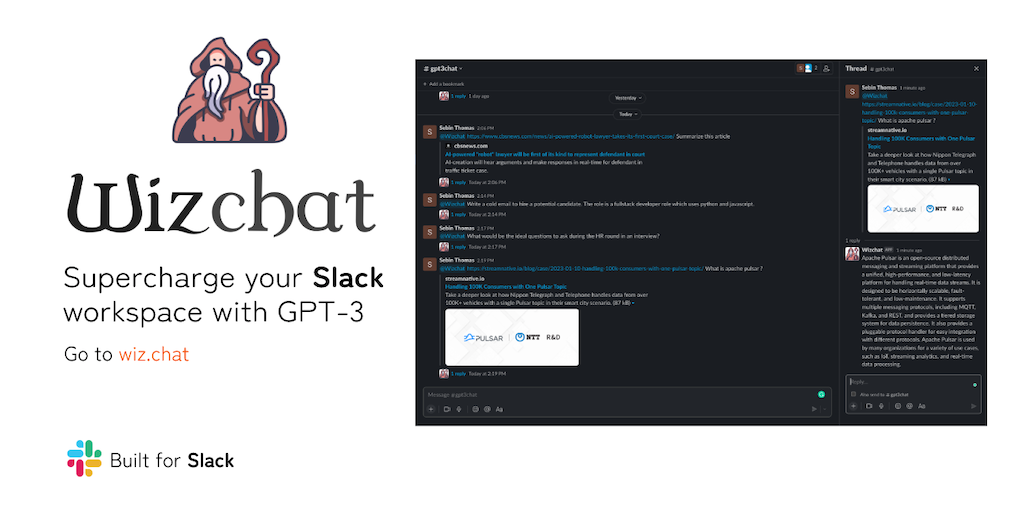 Wizchat lets you add GPT-3 capabilities to your Slack workspace. Simply invite the @Wizchat bot to your channel, mention @Wizchat, type in your prompt and watch the power of GPT-3 transform your team'