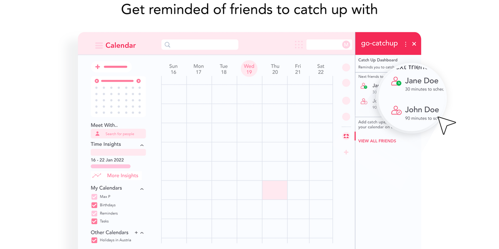 Friendships are important to you, but sometimes life gets in the way! The go-catchup add on for Google Workspace™ reminds you to regularly catch up with a large group of friends - one friend at a time