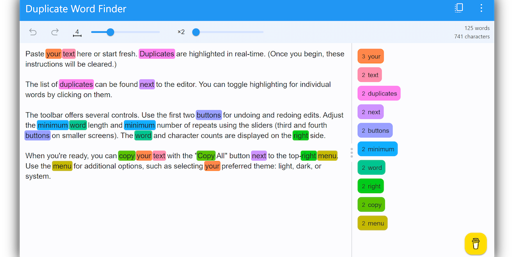 Find duplicate words in your writings. Paste your text or type in the editor, duplicates are highlighted in real-time. Adjust the minimum word length and the minimum number of repeats to be highlighte