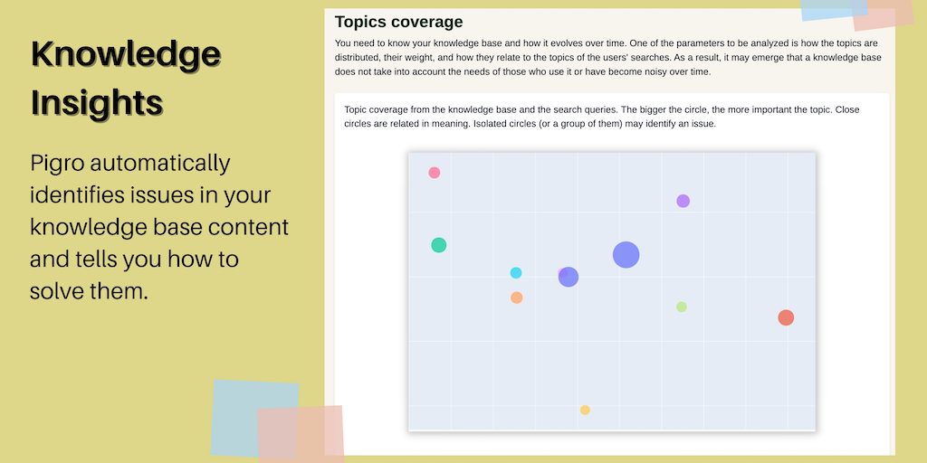 Pigro allows you to measure the quality of your knowledge base, tracking and identifying issues in content effectiveness. Boost your workforce productivity by improving your support content and search
