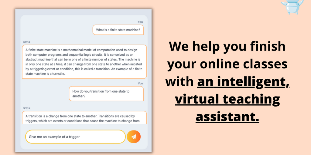 Botta is an AI Teaching Assistant that wants to help you succeed in your online classes. Ask her open and closed questions and she will guide you to an answer.