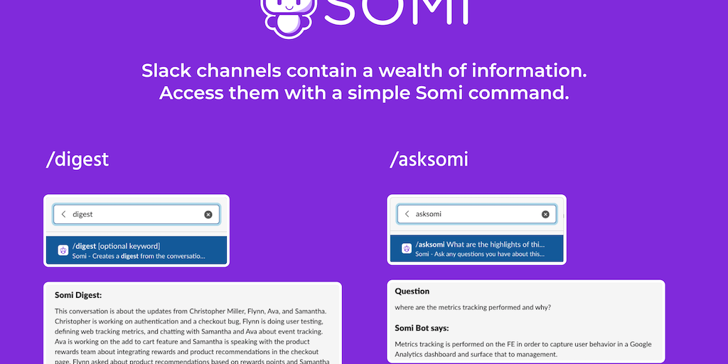 Somi seeks to answer all of your workplace questions. Try asking it to summarize an entire slack channel or answer a specific question! Somi will answer as accurately as it can based on the contents i